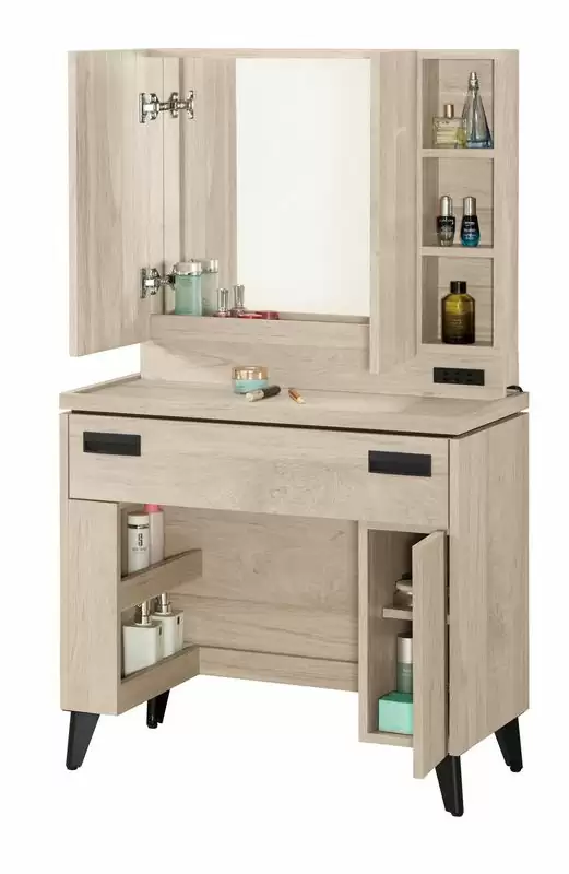 達里歐2.65尺化妝台含椅 首頁 產品型錄 床組+衣櫃 達里歐床組 達里歐2.65尺化妝台含椅 產品型號 : 1173-3 線上型錄 滿萬折千 價格 : 10500 規格選項 : 達里歐2.65尺化妝台含椅 數量 : 加入詢價車 達里歐2.65尺化妝台含椅 價格 : $ 10500 寬76 深40 高144 公分 材質:正面.側板採用符合國際標準低甲醛防蛀木心板 塗裝:採用PU耐磨耐水塗裝 表面:專利技術耐磨浮雕木紋,觸感猶如實木 抽屜:採用鋼珠滑軌 後鈕:採用油壓緩衝五金 手把:鋁合金烤漆手把 腳架:黑砂粉體烤漆五金架 背板:美背處理 鏡台:開門式門片內可收納,附110V插座,椅子可掀開置物