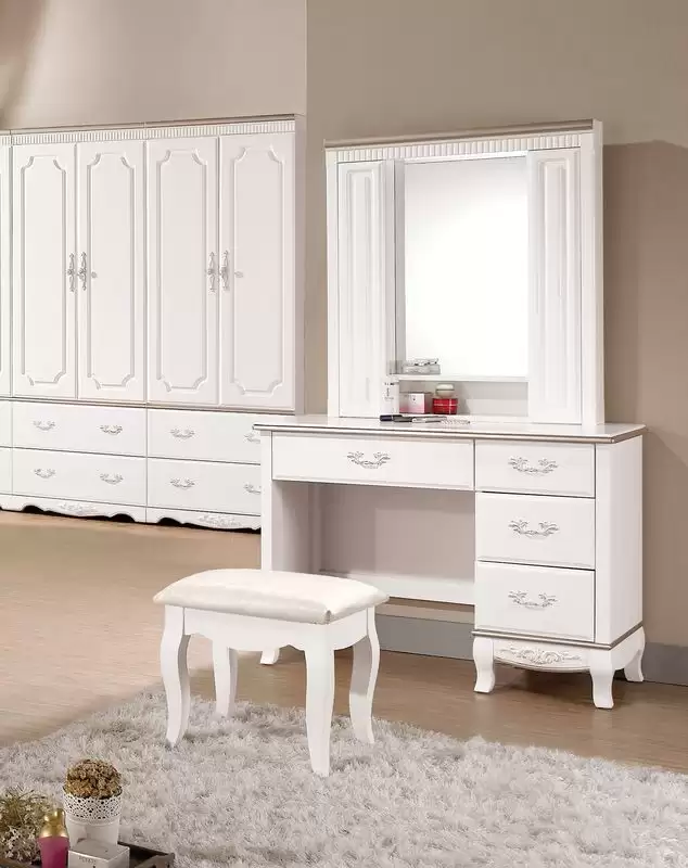 諾維雅3.5尺化妝台含椅 首頁 產品型錄 床組+衣櫃 諾維雅床組+組合衣櫥 諾維雅3.5尺化妝台含椅 產品型號 : 2293-3 線上型錄 滿萬折千 價格 : 17700 規格選項 : 諾維雅3.5尺化妝台含椅 數量 : 加入詢價車 諾維雅3.5尺化妝台含椅 價格 : $ 17700 寬104 深45 高167 公分 正面:實木+18mm MDF全包式材質三層噴漆 材質:低甲醛防蛀木心板 桌面:25mm MDF全包式材質三層噴漆 塗裝:採用優利坦(環保漆)經紅外線處理耐磨耐防黃烤漆塗裝 抽屜:採用鋼珠滑軌,底板5mm夾板 背板:美背處理 手把:古典雙色烤漆手把