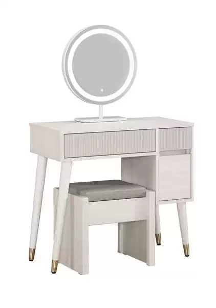 蘿克斯2.7尺化妝台含椅 首頁 產品型錄 床組+衣櫃 蘿克斯床組 蘿克斯2.7尺化妝台含椅 產品型號 : 1049-3 線上型錄 滿萬折千 價格 : 11100 規格選項 : 蘿克斯2.7尺化妝台含椅 數量 : 加入詢價車 蘿克斯2.7尺化妝台含椅 價格 : $ 11100 寬80 深40 高129 公分 材質:採用符合國際標準低甲醛防蛀木心板 塗裝:採用PU耐磨耐水塗裝 表面:專利技術耐磨浮雕木紋,觸感猶如實木 側板:採用木心板導弧形造型 抽屜:採用鋼珠滑軌,1.8mmMDF材質CNC加工成型 (三層噴漆) 後鈕:採用油壓緩衝五金 腳架:實木噴漆+白銀鐵包覆處理 背板:美背處理 鏡台:採用LED觸控式三段亮燈模式 化妝椅:可掀開置物