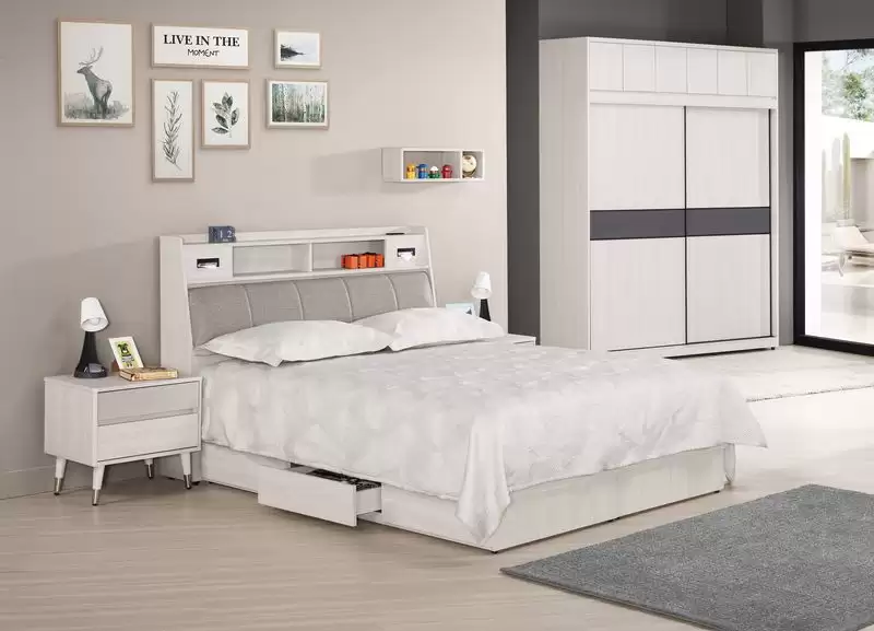 床頭:採用人工乳膠皮革(貓抓皮)+高密度泡棉,附110V插座使用,面紙抽設計