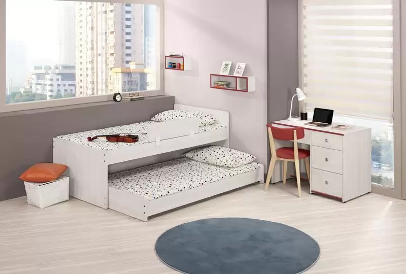 哈利斯3.5尺子母床 首頁 產品型錄 單身系列+子母床 哈利斯3.5尺子母床 哈利斯3.5尺子母床 產品型號 : 1273-2 線上型錄 滿萬折千 價格 : 17100 規格選項 : 哈利斯3.5尺子母床 數量 : 加入詢價車 哈利斯3.5尺子母床 價格 : $ 17100 (上)寬113 深193 高82 公分 (搭106x188薄墊) (下)寬92 深1897 高23 公分 (搭90x182薄墊) 材質:採用符合國際標準低甲醛防蛀木心板+正八分夾板 塗裝:採用PU耐磨耐水塗裝 表面:專利技術耐磨浮雕木紋,觸感猶如實木 背板:美背處理 床板:四分正夾板 (可左右擺放)