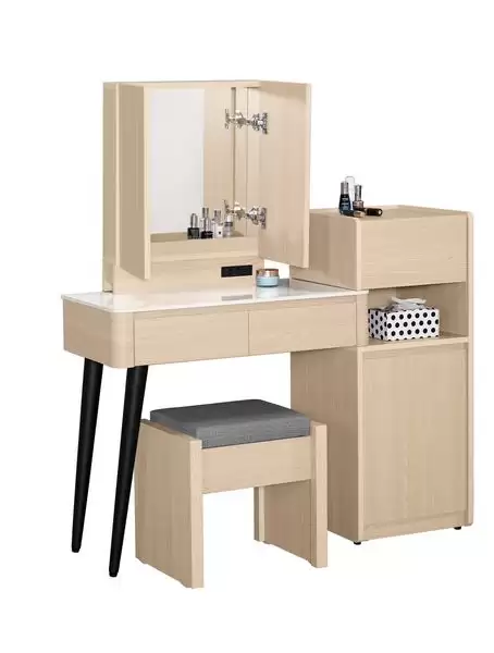 艾維斯2.7尺岩板伸縮化妝台含椅(木門) 首頁 產品型錄 床組+衣櫃 艾維斯床組 艾維斯2.7尺岩板伸縮化妝台含椅(木門) 產品型號 : 1183-1 線上型錄 滿萬折千 價格 : 15500 規格選項 : 艾維斯2.7尺岩板伸縮化妝台含椅(木門) 數量 : 加入詢價車 艾維斯2.7尺岩板伸縮化妝台含椅(木門) 價格 : $ 15500 寬82~116 深40 高135 公分 材質:採用符合國際標準低甲醛防蛀木心板,安全彎角:使用曲面弧度加工一體成形 塗裝:採用PU耐磨耐水塗裝 表面:專利技術耐磨浮雕木紋,觸感猶如實木 抽屜:採用三節式鋼珠滑軌 後鈕:採用油壓緩衝五金 背板:美背處理 化妝台:開門式門片內可收納,附110V插座,椅子可掀開置物 桌面:採用高硬度天然原石經高壓機加工高溫燒製而成,耐磨耐高溫(12mm岩板)