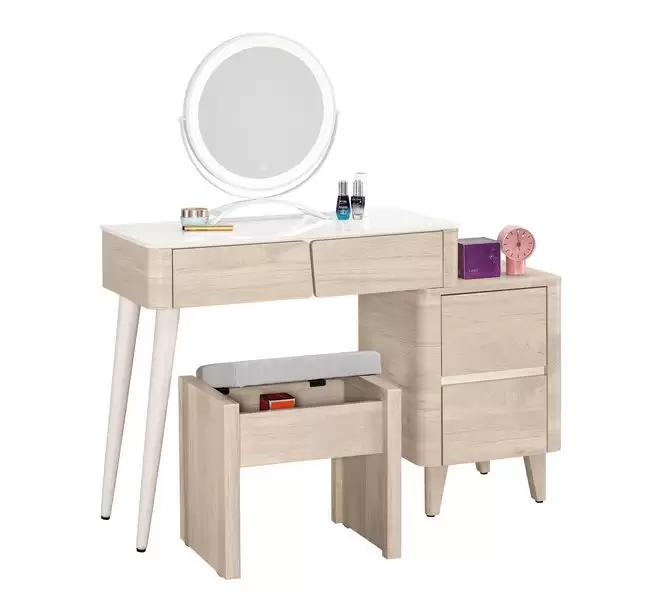 丹尼爾2.7尺岩板伸縮化妝台含椅 首頁 產品型錄 床組+衣櫃 丹尼爾床組 丹尼爾2.7尺岩板伸縮化妝台含椅 產品型號 : 1159-3 線上型錄 滿萬折千 價格 : 13800 規格選項 : 丹尼爾2.7尺岩板伸縮化妝台含椅 數量 : 加入詢價車 丹尼爾2.7尺岩板伸縮化妝台含椅 價格 : $ 13800 寬82~109 深40 高122 公分 材質:採用符合國際標準低甲醛防蛀木心板 塗裝:採用PU耐磨耐水塗裝 表面:專利技術耐磨浮雕木紋,觸感猶如實木 側板:採用木心板曲線弧形加工一體成型 抽屜:採用三節式鋼珠滑軌 背板:美背處理 腳架:14cm實木腳 化妝台:鏡框採用LED觸控式三段亮燈模式 .防鏽鐵件噴漆,二抽櫃可左右擺放,化妝椅:可掀開置物 桌面:採用高硬度天然原石經高壓機加工高溫燒製而成,耐磨耐高溫(12mm岩板)