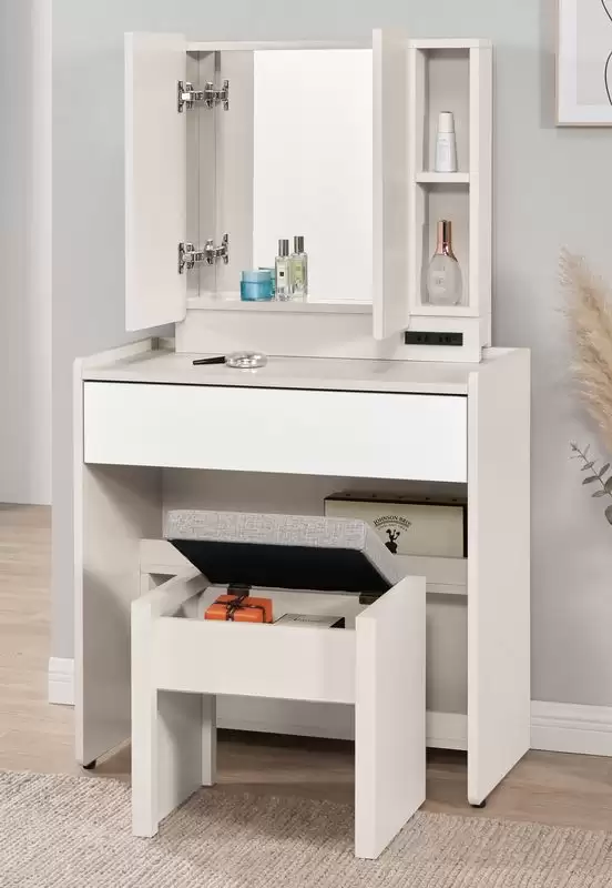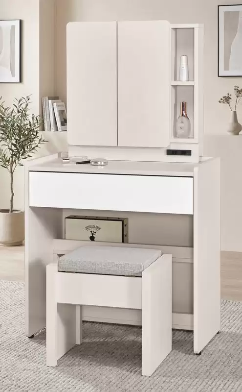 佩洛斯2.5尺化妝台含椅 首頁 產品型錄 床組+衣櫃 佩洛斯床組 佩洛斯2.5尺化妝台含椅 產品型號 : 2009-4 線上型錄 滿萬折千 價格 : 10800 規格選項 : 佩洛斯2.5尺化妝台含椅 數量 : 加入詢價車 佩洛斯2.5尺化妝台含椅 價格 : $ 10800 寬75 深40 高139 公分 材質:採用台灣製造A級環保木心板+1.0mmABS封邊 表面:採用PVC壓皮革紋 塗裝:採用PU耐磨耐水塗裝 抽屜:採用三節式鋼珠滑軌 背板:美背處理 門片:採用油壓緩衝後鈕 手把:斜邊無把手設計 化妝台:開門式門片內可收納,採用安全開關插座 化妝椅:可掀開置物