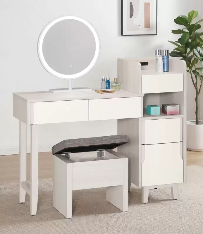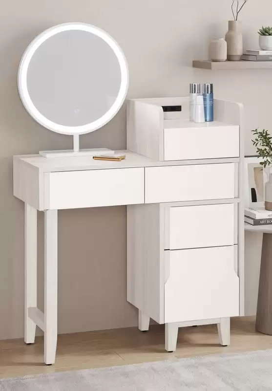 娜迪亞2.7尺伸縮化妝台含椅 首頁 產品型錄 床組+衣櫃 娜迪亞床組 娜迪亞2.7尺伸縮化妝台含椅 產品型號 : 2027-2 線上型錄 滿萬折千 價格 : 13900 規格選項 : 娜迪亞2.7尺伸縮化妝台含椅 數量 : 加入詢價車 娜迪亞2.7尺伸縮化妝台含椅 價格 : $ 13900 寬80~109 深40 高130 公分 材質:採用符合國際標準低甲醛防蛀木心板 塗裝:採用PU耐磨耐水塗裝 面板:採用美耐皿木心板材質,具有耐高溫.耐刮磨特性 抽屜:採用三節式滑軌 背板:美背處理 手把:採用J型封邊技術.美觀.防潮.耐用 化妝台:採用安全開關插座,鏡框採用LED觸控式三段亮燈模式 化妝椅:可掀開置物