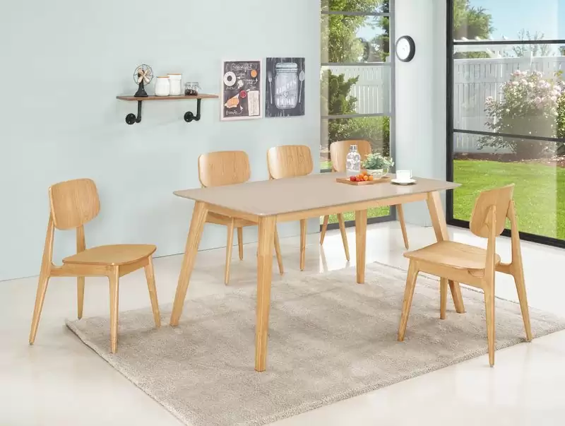 雪倫5尺餐桌 首頁 產品型錄 餐桌+餐椅 淺色餐桌 雪倫5尺餐桌 產品型號 : 1753-2 線上型錄 滿萬折千 價格 : 5500 規格選項 : 雪倫5尺餐桌 數量 : 加入詢價車 雪倫5尺餐桌 價格 : $ 5500 寬150 深90 高75 公分 桌面:高級MDF全烤式材質 腳架:橡膠木實木 塗裝:採用優利坦耐磨耐水塗裝 圖片餐椅 https://www.chunglong.com/product/835